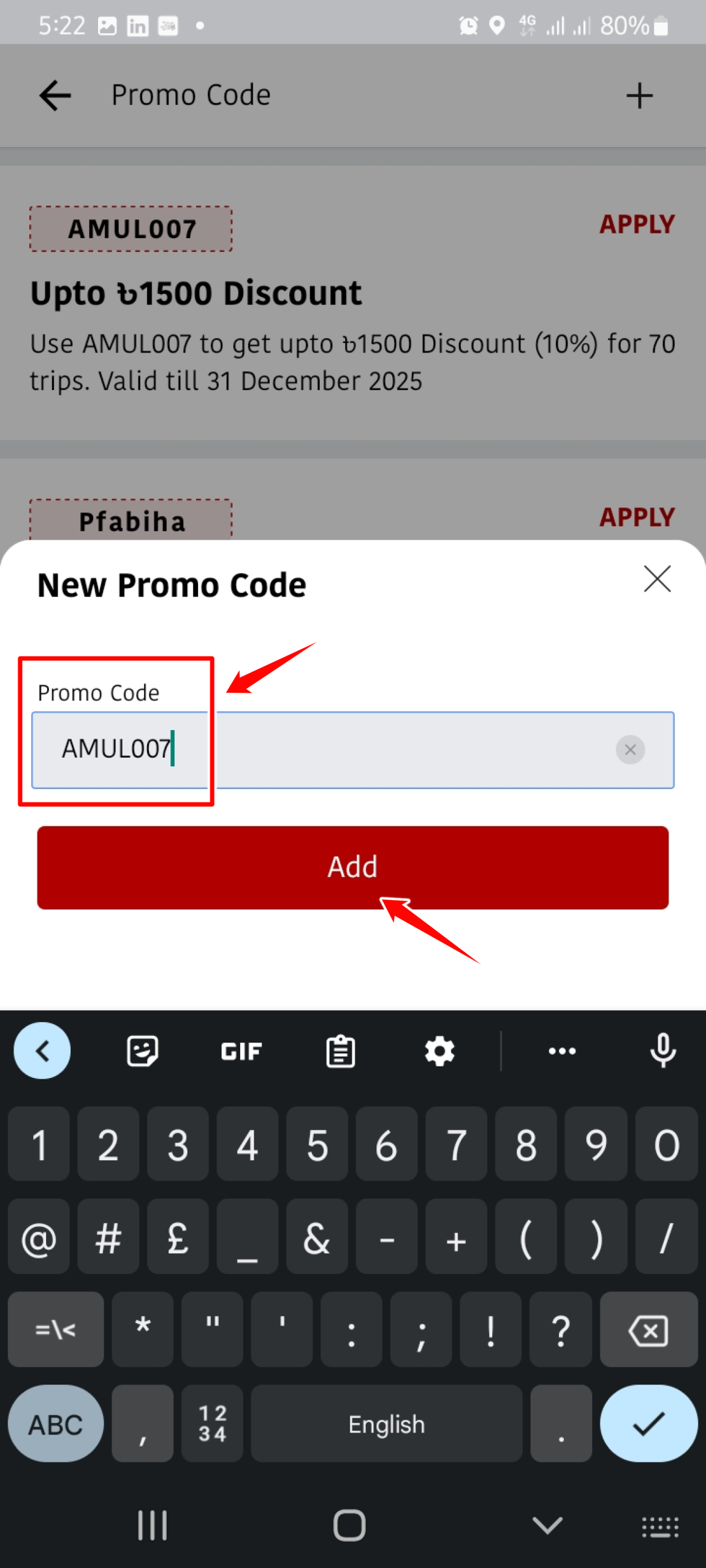 4. Enter the promo code you want to use and click “Add”.